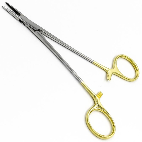 Иглодержатель ДеБейки (DeBakey), сосудистый, твердосплавная вставка из карбида вольфрама, мелкой нарезки Х-типа, с покрытием ручек карбидом титана (желтого цвета), 150 мм