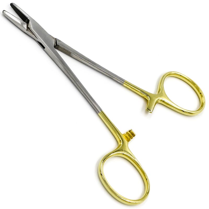 Иглодержатель Мейо-Гегара (Mayo-Hegar), общехирургический, твердосплавная вставка из карбида вольфрама, мелкой нарезки Х-типа, с покрытием ручек карбидом титана (желтого цвета), 125 мм