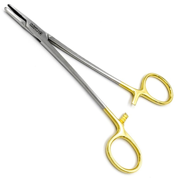 Иглодержатель Мейо-Гегара (Mayo-Hegar), общехирургический, твердосплавная вставка из карбида вольфрама, мелкой нарезки Х-типа, с покрытием ручек карбидом титана (желтого цвета), 150 мм