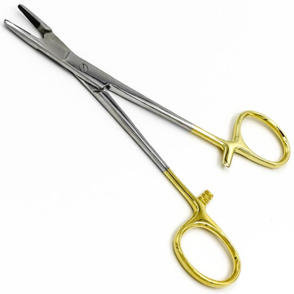 Иглодержатель-ножницы Ольсена-Гегара (Hegar-Olsen), твердосплавная вставка из карбида вольфрама, мелкой нарезки Х-типа, с покрытием ручек карбидом титана (желтого цвета), 140 мм