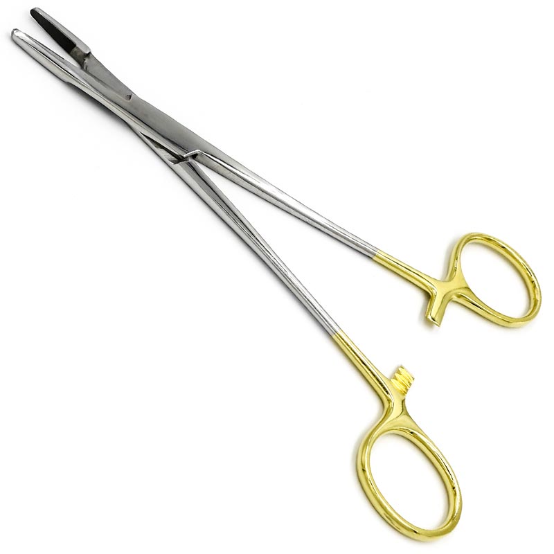 Иглодержатель-ножницы Ольсена-Гегара (Hegar-Olsen), твердосплавная вставка из карбида вольфрама, мелкой нарезки Х-типа, с покрытием ручек карбидом титана (желтого цвета), 160 мм