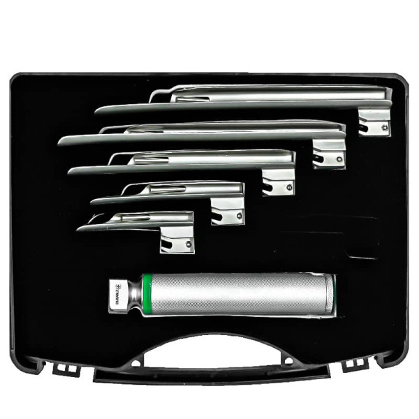 Ларингоскоп Миллера, набор из 5-х клинков прямых и рукоятка, в футляре, волоконнооптические, с отрицательным световодом.