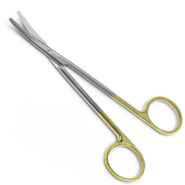 Ножницы по Метценбауму-Лахей, вертикально-изогнутые, твердосплавная вставка из карбида вольфрама, с покрытием ручек карбидом титана (желтого цвета), тупоконечные, 140 мм.