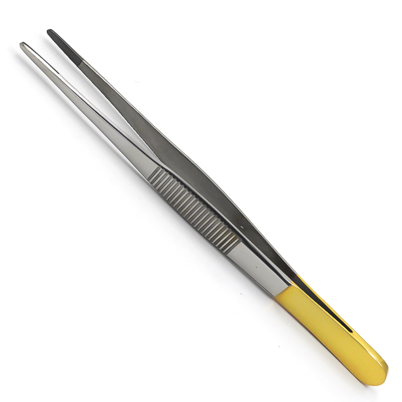 Пинцет анатомический, твердосплавная вставка из карбида вольфрама, мелкой нарезки Х-типа, с покрытием ручек карбидом титана (желтого цвета), 150 мм х 0,6 мм.