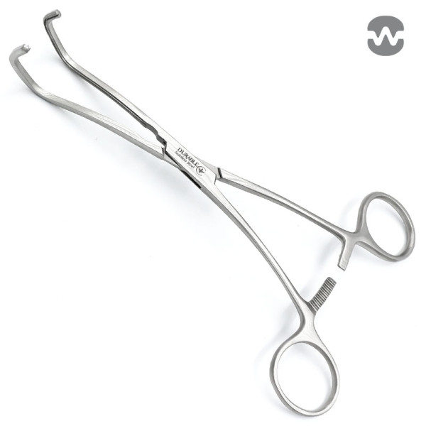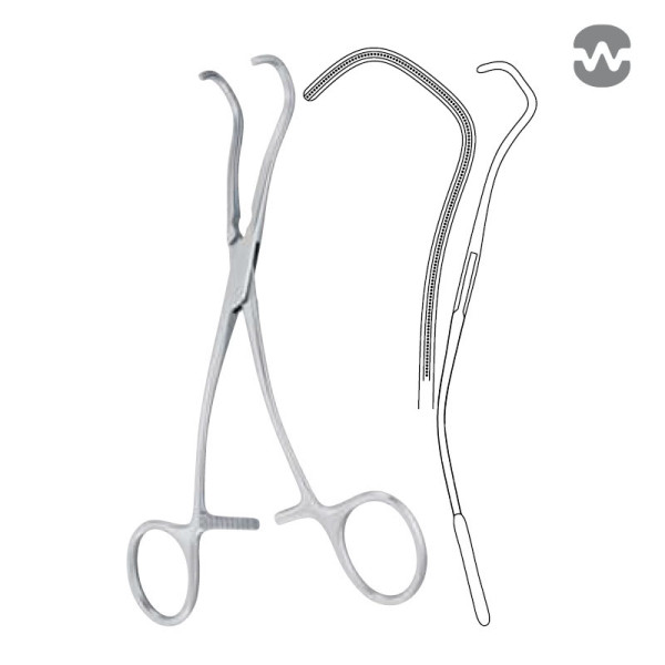Зажим атравматический Дерра (Derra), двуугловой, изогнутые рукоятки, бранши 75 мм, 175 мм